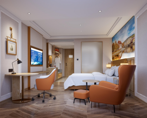 在浪漫经济兴起的大背景下,酒店行业也在不断寻求差异化竞争的突破口。维也纳酒店V5.0版顺应时代潮流,迎合了消费者对于浪漫的需求,致力与消费群体的“同频共振”。庄园轻居式客房整体空间采用米白+原木色调,简化的欧式线条和装饰,点缀logo的珊瑚橙,布置着欧洲南部庄园风情画、多级调节柔和阅读灯、休闲风米橙沙发躺椅和自然呼吸仿木纹地板,健康灵动的空间,清雅不失活力。通过与经典元素的融合,维也纳酒店V5.0在风格上呈现出更加时尚、现代的格调,满足了消费者对于浪漫、优雅住宿空间的追求。同时,维也纳酒店在提供高性价比的同时,也不断挖掘和满足消费者的新需求,以实际行动诠释着品牌的态度与思维方式。