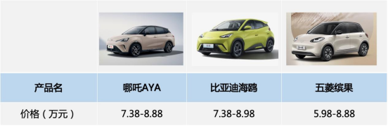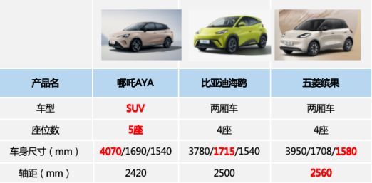 首先从造型来看,哪吒AYA整体呈现低趴姿态,更有运动感和俯冲感,适合各个年龄段,不同性别的用户;比亚迪海鸥轮廓可爱灵动,整体看起来比较娇小,更适合女性用户;五菱缤果则为复古风,圆润呆萌,能够戳中不少年轻女性的萌点。