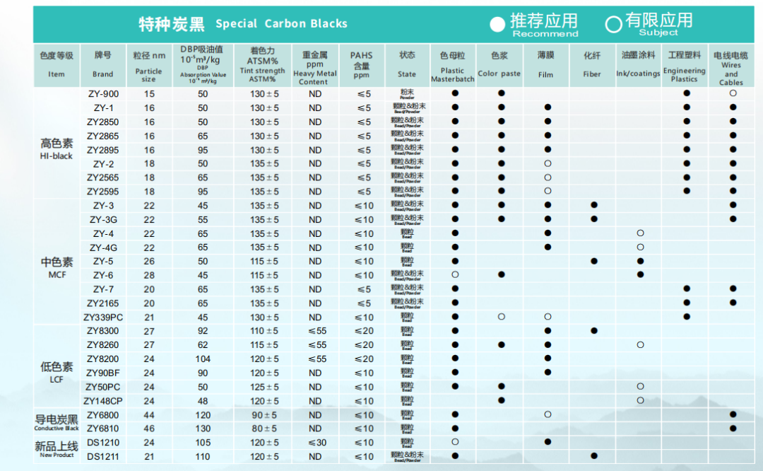 ●炭黑产品: 混气炭黑:ZY-611、ZY-311 色素炭黑:ZY900丶ZY-1、ZY-2、ZY-3、ZY-4、ZY-5、ZY-6、ZY-7、ZY90BF、ZY268、ZY-8200等、混气炭黑、ZY-611、ZY-311、热裂法炭黑(N990)等 橡胶用炭黑:N110、N330、N326、N375、N220、N234、N550、N539、N660、N774、天然气半补强炭黑。