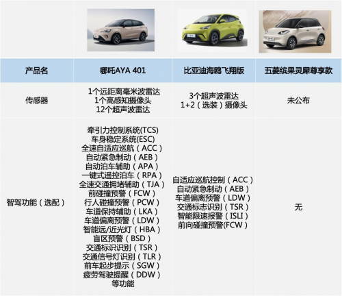 再看其他两款车型,比亚迪海鸥的屏幕尺寸仅为10.1英寸,从视觉上就不够拉风,智驾包的功能丰富度也不如哪吒AYA,数量还不到哪吒AYA的一半。五菱缤果虽然拥有双10.25英寸屏幕,但甚至没有配备OTA升级功能,也没有智驾包可选,尽管是顶配版型,但仍然只有ABS+EBD、ESC电子车身稳定系统等基础功能,相当没有性价比,购买还需谨慎。