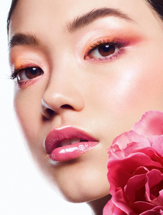 广告中的Mika Schneider 绽放出令人眩目的美。她的眼妆清新亮丽,彰显了娇兰鎏金四色眼影 530(玫瑰红棕)的柔美色彩。她的双唇闪亮丰盈,使用的是娇兰亲亲蜜吻精华唇蜜 258。