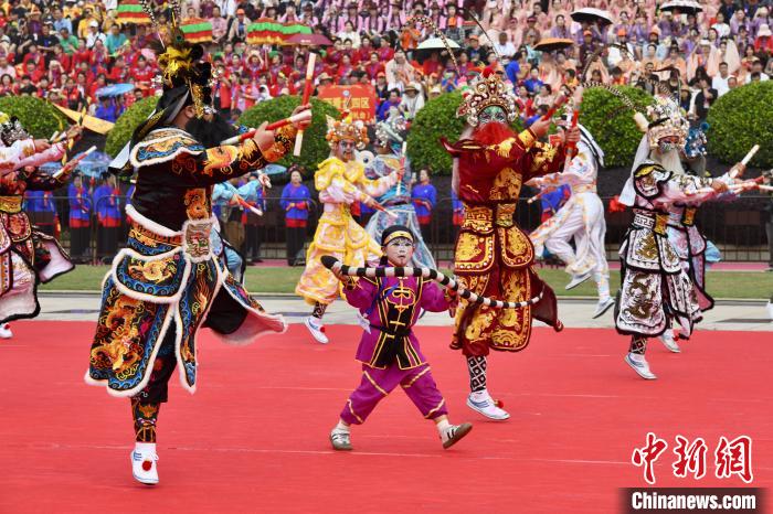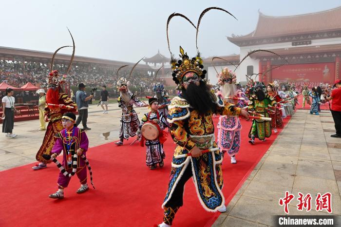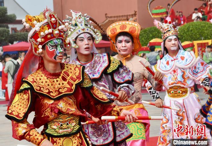 4月20日,潮汕英歌舞亮相“妈祖故里”福建莆田湄洲岛。当日,纪念妈祖诞辰1065周年大会暨春祭妈祖大典在湄洲妈祖祖庙天后广场隆重举行。中新社记者 王东明 摄