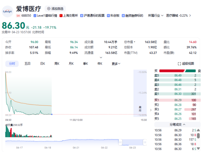 4月23日,爱博医疗(688050)盘中股价大跌,一度跌逾19%。截至北京商报记者发稿,爱博医疗报87.5元/股,跌幅为18.59%。