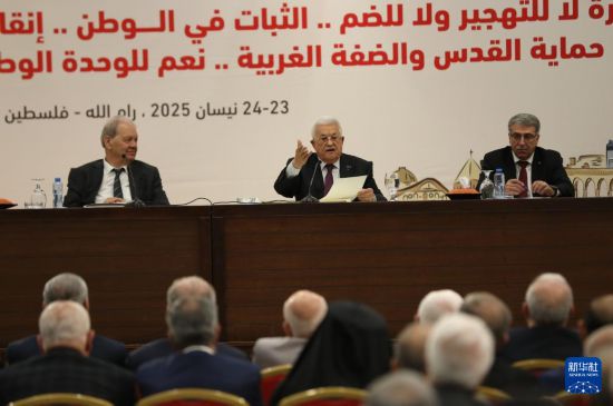 4月23日,巴勒斯坦总统阿巴斯(中)在约旦河西岸城市拉姆安拉出席巴勒斯坦解放组织(巴解组织)中央委员会第32次会议。新华社发(艾曼·诺巴尼摄)