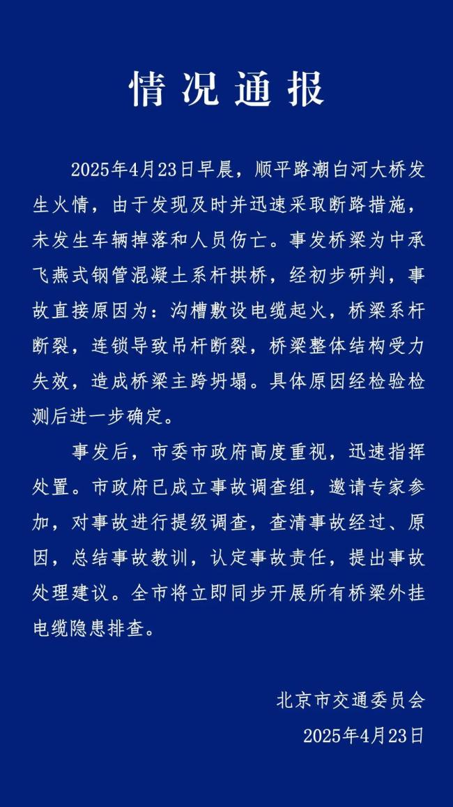 北京市交通委通报顺平路潮白河大桥事故直接原因,市政府已成立事故调查组 电缆起火致桥梁坍塌