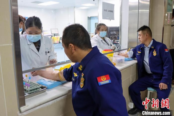 图为4月23日,西藏左贡森林消防员到医院献血。姚天锐 摄