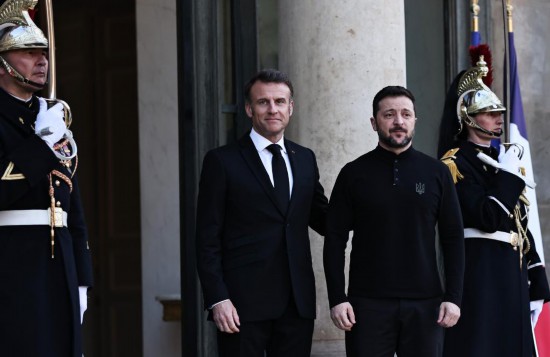 3月26日,法国总统马克龙(中左)在巴黎总统府爱丽舍宫迎接到访的乌克兰总统泽连斯基。新华社记者高静摄