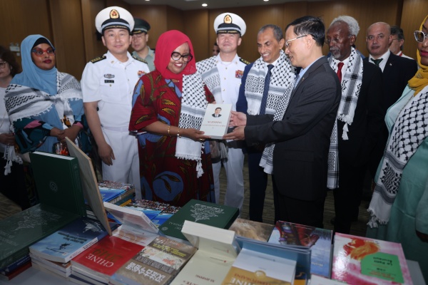 中国吉布提大使胡斌向吉方赠书。主办方供图