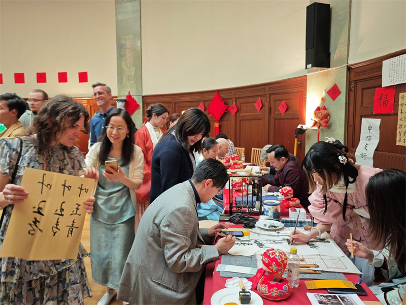 随后,来宾们根据自己的兴趣进行不同的中华文化体验,来自瑞典的青少年下起了象棋;在书法展示区,大家排起长队,等待用中文写下自己的名字,学习瑞典、中国、中瑞友好等汉字的写法;在中国画展示区,大家一起做版画、画扇面,欣赏工笔画的精巧,以及写意画的意蕴;在汉服展示和手工制作区域,来宾踊跃试穿汉服并合影,制作灯笼、剪纸等中华传统工艺品。