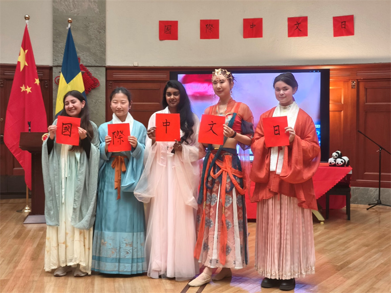 来宾展示“国际中文日”字样。中国驻哥德堡总领馆供图