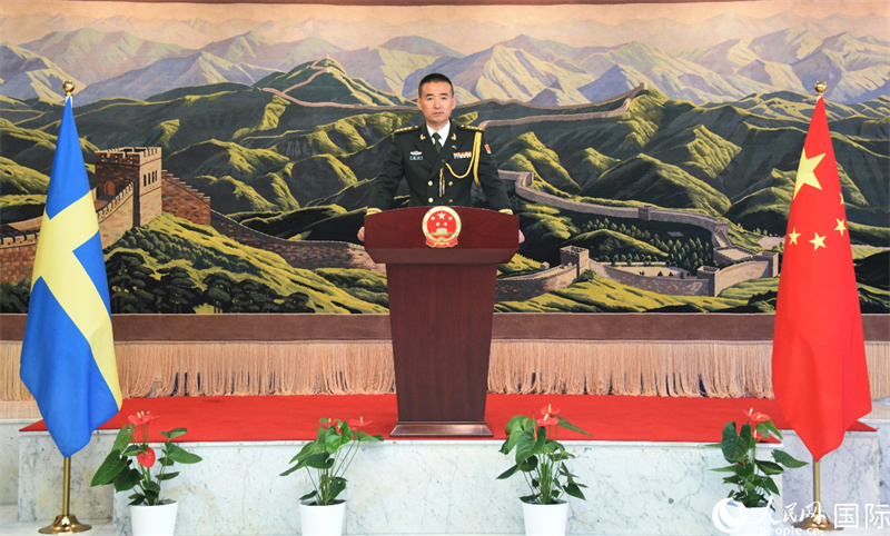 中国驻瑞典大使馆新任国防武官袁林大校致辞。人民网记者 殷淼摄