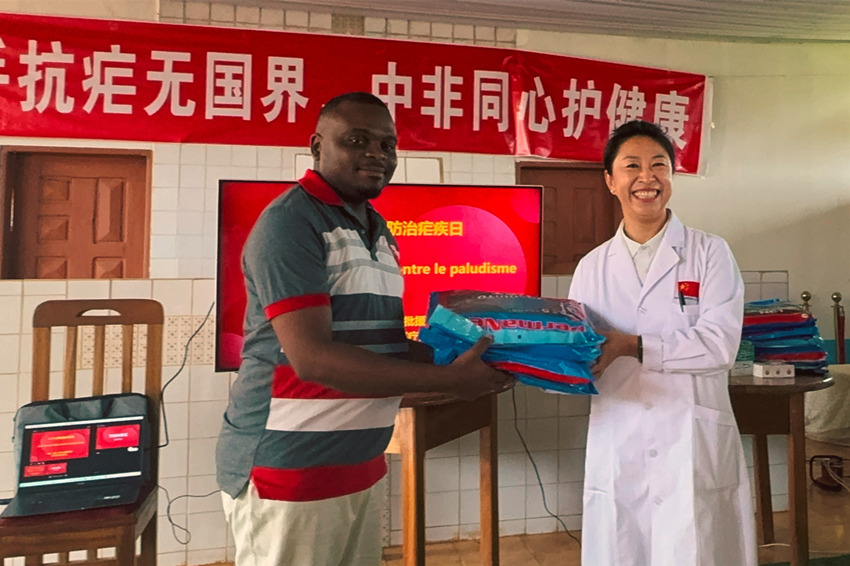 赠送抗疟物资。中国(山西)第24批援喀麦隆姆巴尔马尤医疗队供图