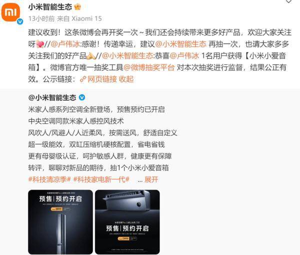 小米智能生态为了宣传新推出的米家人感系列空调,在微博上发起了一个抽奖活动,奖品是一个小爱音箱。结果公布时,大家发现最终获奖者竟然是小米集团总裁卢伟冰。这一结果引起了网友们的热议。有人认为这是算法的小玩笑,也有人调侃说有黑幕。不过,也有网友表示,这样的结果恰恰证明了微博抽奖的公平性,因为不避嫌。