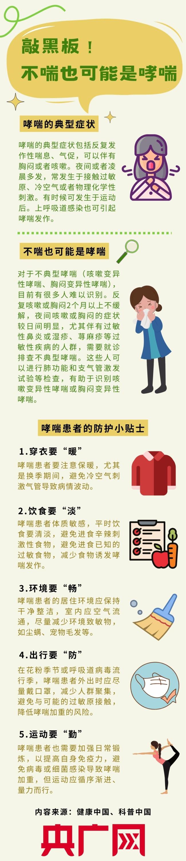 央广网北京5月6日消息,每年5月的第一个周二是“世界哮喘日”。哮喘,全称“支气管哮喘”,是一种慢性气道炎症性疾病。这种疾病的主要症状包括呼吸困难、胸闷、咳嗽以及喘息声。对于哮喘患者来说,在日常生活中做好防护非常重要。了解相关知识有助于更好地管理病情。