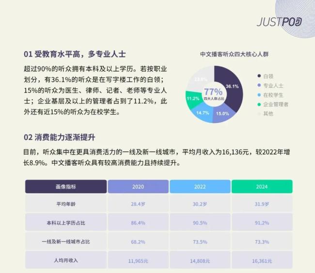 播客的“精英”属性确实聚拢了一批优质用户,但这也意味着播客一直未真正走入大众市场。Just Pod的报告显示,国内播客听众学历高、消费能力强,集中在更具消费活力的一线及新一线城市,平均月收入为16136元。