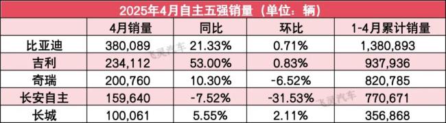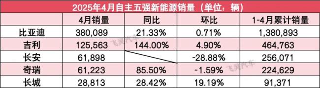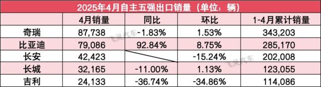 自主5强4月销量:长城重回10万,吉利电车翻番,比亚迪猛攻出口