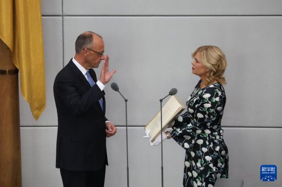 5月6日,在德国首都柏林的国会大厦,默茨(左)宣誓就职。新华社记者 杜哲宇 摄