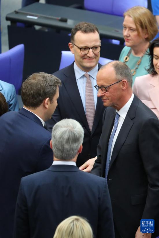 5月6日,在德国首都柏林的国会大厦,默茨(左二)当选后接受祝贺。新华社记者 杜哲宇 摄