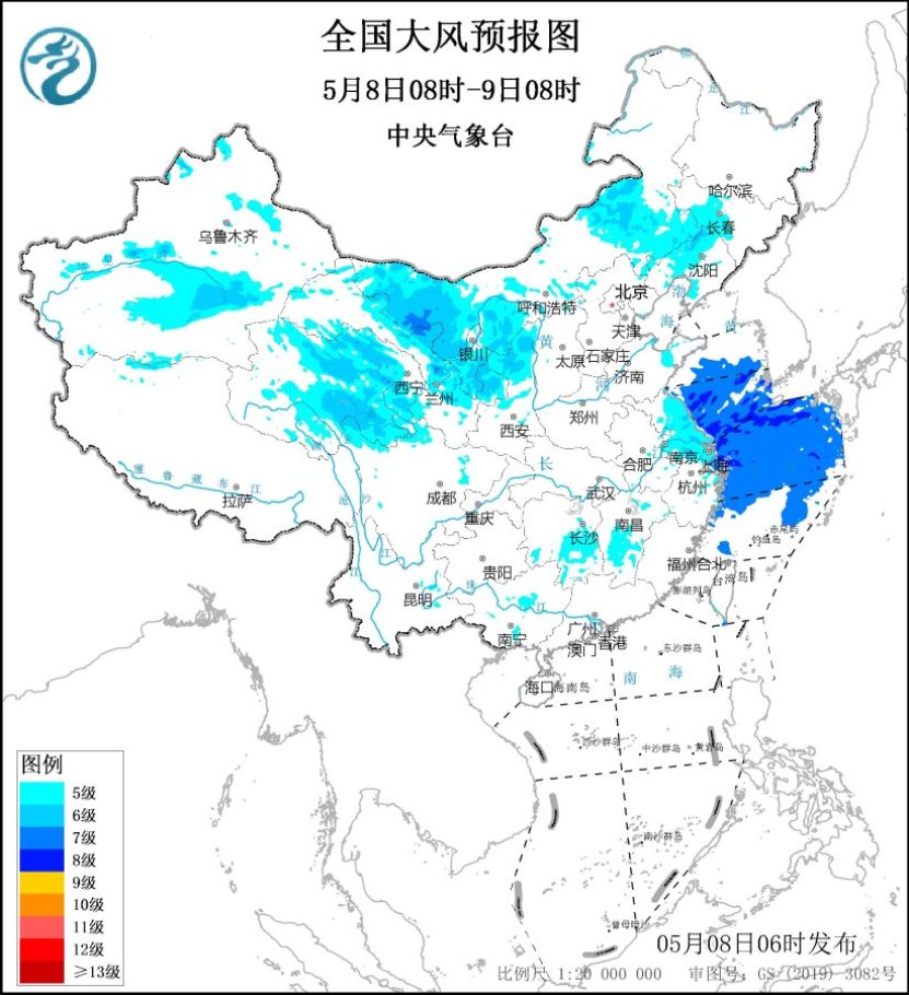中央气象台5月8日06时发布大风蓝色预警:预计,5月8日08时至9日08时,新疆南疆盆地、内蒙古、青海、甘肃东部、宁夏、陕西北部、辽宁西部、江苏、浙江等地部分地区有5~6级、阵风7~8级,其中,内蒙古西部等地的部分地区平均风力可达7级、阵风8~10级;黄海中部和南部海域、东海大部海域将有7~8级、阵风9级的大风,其中东海东北部部分海域将有9级、阵风10级大风。