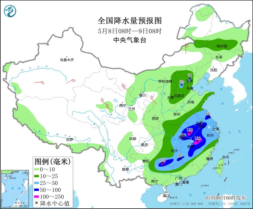 5月8日08时至9日08时,江淮大部、江汉东部、江南西南部和中东部、华南北部以及华北东北部等地部分地区有大到暴雨,其中,安徽西南部、湖北东部、江西东北部、浙江西部、广西北部等地部分地区有大暴雨(100~180毫米),上述部分地区伴有短时强降水(最大小时降雨量30~60毫米,局地可超过80毫米),局地有雷暴大风冰雹等强对流天气。新疆南疆盆地、内蒙古、青海、甘肃东部、宁夏、陕西北部、辽宁西部、江苏、浙江等地部分地区有5~6级、阵风7~8级;黄海中部和南部、东海大部有7~8级、阵风9级的大风。