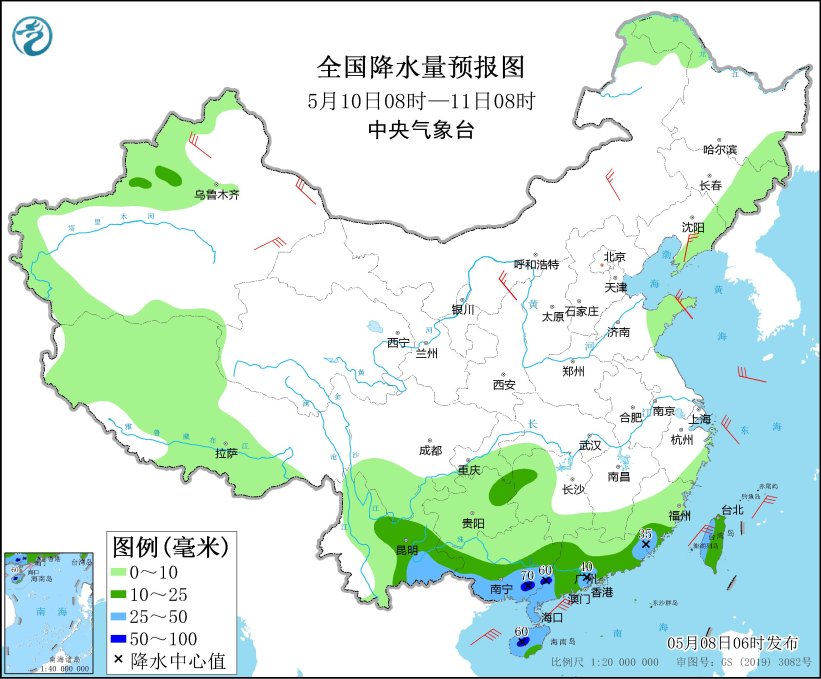 5月10日08时至11日08时,华南大部、云南东部、新疆伊犁河谷、台湾岛等地部分地区有中到大雨,其中,广西东南部、广东西南部、海南岛中部等地部分地区有暴雨(50~70毫米)。内蒙古中东部、华北北部和西部、黄淮、江淮、新疆东部等地部分地区有4~6级风。