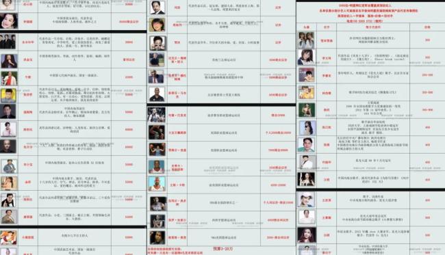 一些知名度较高的报价普遍在万元以上,其中张铁林6.5万、范冰冰8~10万、柳岩13万、黄圣依18万,沈腾20万。