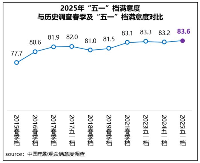 2025年“五一”档观赏性得分83.4分,思想性得分83.0分,传播度得分84.7分;与前两年同期对比,首次实现满意度三大指数都超过83分,且其中档期传播度增长显著,分别较2023年和2024年“五一”档高出2.9分、2.7分。