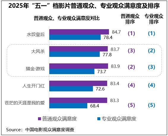 2025年“五一”档调查的五部影片普通观众和专业观众满意度综合评价趋同,《水饺皇后》都居第一,《人生开门红》《苍茫的天涯是我的爱》则都居后两位;只是单片满意度居第二三位的两部影片评价略有差异,专业观众对于“作者性”相对较强的《大风杀》评价更高,普通观众则对商业化属性更突出的《猎金・游戏》满意度更高。