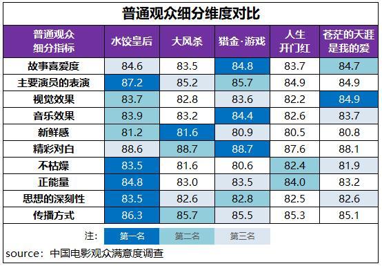 在普通观众评价体系中,各影片细分指标创作得分各有亮点,《水饺皇后》主要演员的表演、不枯燥、正能量、思想的深刻性和传播方式六项指标得分都为档期最高;《猎金・游戏》的故事喜爱度、音乐效果和精彩对白三项指标得分最高;《大风杀》的新鲜感、《苍茫的天涯是我的爱》的视觉效果也都得到了观众的档期最高评分。此外,《人生开门红》的不枯燥、正能量得分都居档期第二位。