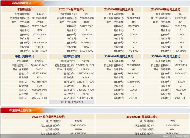 北京市住建委官网数据显示,5月8日北京新房网签242套,网签面积17168.11平方米,其中住宅网签207套,网签面积11978.43平方米;二手房网签703套,网签面积61843.57平方米,其中住宅网签624套,网签面积56686.27平方米。