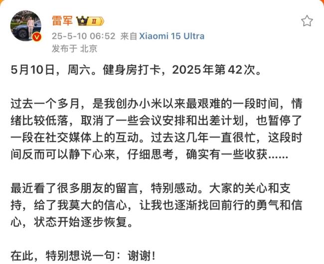 同日上午,雷军在社交媒体上复更健身打卡,并分享了自己的心情。他表示,过去一个多月是他创办小米以来最艰难的一段时间,情绪低落,取消了一些会议安排和出差计划,也暂停了社交媒体上的互动。这段时间虽然忙碌减少,但给了他静心思考的机会,从中获得了一些收获。他还提到,朋友们的留言和支持让他感到非常感动,这些关心给了他巨大的信心,使他逐渐找回了前行的勇气和信心,状态也开始逐步恢复。雷军特别感谢大家的支持。