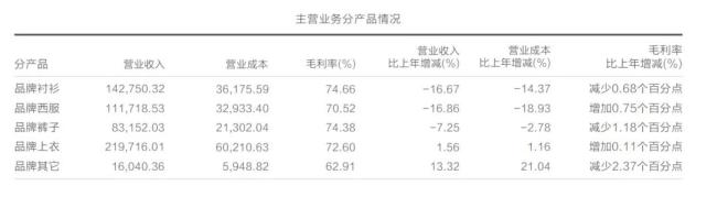 去年,公司的衬衫、西服、裤子分别销售474.33万件、71.46万套以及211.45万条,收入分别为14.28亿元、11.17亿元和8.32亿元,同比分别下降16.67%、16.86%和7.25%。