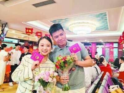 婚姻登记服务中心装饰喜庆,处处洋溢着甜蜜气息。谷金泽和于越向登记员出示了身份证和合照,并提交了签署后的告知单和个人信用信息风险告知书等材料。经过婚前问询、婚姻状况信息联网核对后,两人签字并按指印,顺利领取了结婚证。