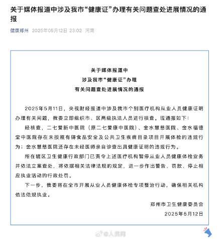 河南省郑州市卫生健康委员会5月12日通报,针对5月11日媒体报道中涉及的个别医疗机构从业人员健康证明办理问题,郑州市卫生健康委员会立即组织市、区两级执法人员进行核查。