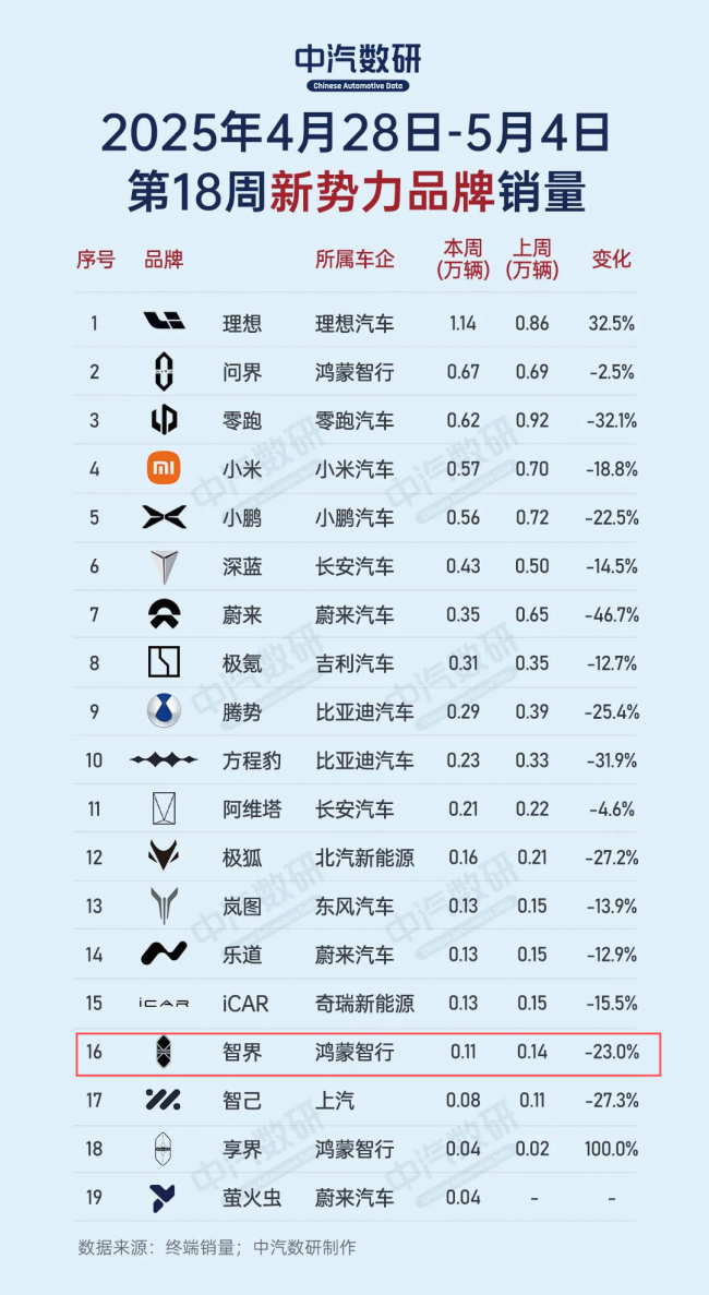 在造车新势力纷纷公布4月成绩单时,鸿蒙智行缺席了榜单。不过,奇瑞方面披露了智界品牌的销量数据。数据显示,今年4月,智界销量仅4461辆,同比下滑10.99%,环比下滑55.41%。作为奇瑞与华为联合打造的新势力品牌,这一成绩单令人失望。