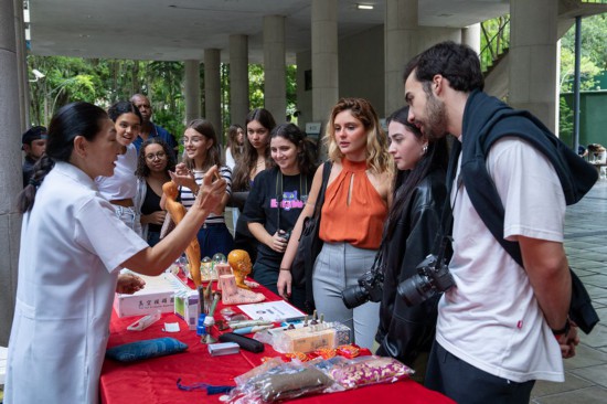 2025年4月15日,在巴西里约热内卢天主教大学举办的“国际中文日”庆祝活动上,学生们观看中医疗法展示。新华社记者 王天聪 摄