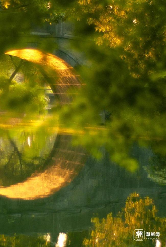 今天一早,实地探访了这个藏在曲院风荷里的网红秘境。“金光穿洞”的绝佳拍摄点位于曲院风荷的月亮桥,从“曲院风荷3号门”往前步行100米即可到达。清晨5点,赶到现场时,发现沿湖的机位早已被抢占一空,排队等待的人群里三层外三层,场面异常火爆。在现场,拍照的年轻人占据了绝大多数,他们手持专业相机或手机,只为拍到更好看的照片。