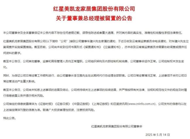 5月13日晚,红星美凯龙家居集团股份有限公司(以下简称美凯龙,601828.SH)发布公告称,公司董事车建兴家属接到云南省监察委员会电话通知,对车建兴立案调查并实施留置措施。目前,公司尚未收到任何书面形式的《留置通知书》或《立案通知书》,也未收到需要协助调查或提供资料的要求。