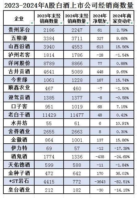 分析2024年酒业财报,20家A股白酒上市公司经销商总数49115家,2023年为51162家,整体规模微幅收窄,酒商强分化趋势进一步加剧。其中,12家酒企经销商净增加,8家酒企经销商数量减少。