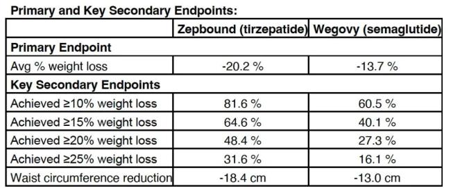 替尔泊肽组平均减重20.2%(50.3磅/22.8kg),较司美格鲁肽组13.7%(33.1磅/15.0kg)高出6.5个百分点;替尔泊肽组腰围平均减少18.4cm,优于司美格鲁肽的13.0cm。