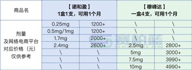 在中国,诺和盈定价约1400元/月,穆峰达暂未明确官方定价。据赛柏蓝在阿里健康、美团买药、京东健康等第三方平台查询,诺和盈每月用量售价在1200元~2600元不等,穆峰达售价在2800元~4990元不等。
