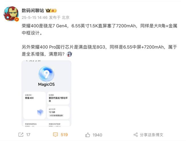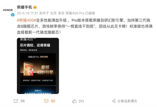 荣耀400全球首发搭载骁龙7Gen4芯片 性能越级突破