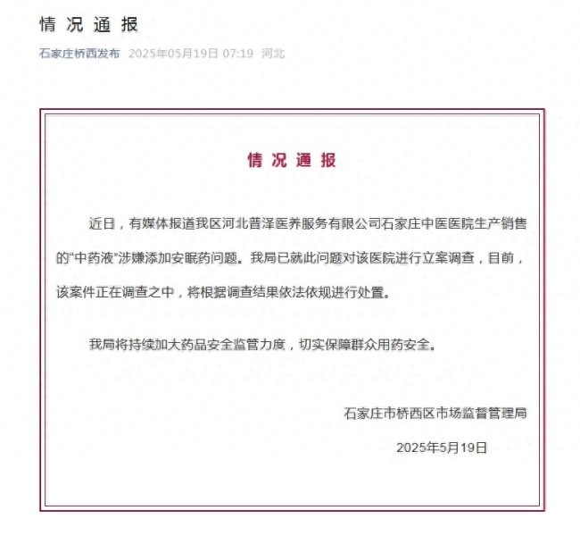 石家庄市桥西区市场监督管理局近日通报,针对媒体报道的河北普泽医养服务有限公司石家庄中医医院生产销售的“中药液”涉嫌添加安眠药的问题,该局已对医院进行立案调查。目前案件正在调查中,将根据调查结果依法依规处理。