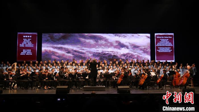 当地时间5月18日晚,加拿大华人团体携手呈现的大型音乐舞蹈史诗《和平颂》在大多伦多地区密西沙加市上演,以纪念世界反法西斯战争暨中国人民抗日战争胜利80周年。图为演员们表演《黄河大合唱》。中新社记者 余瑞冬 摄