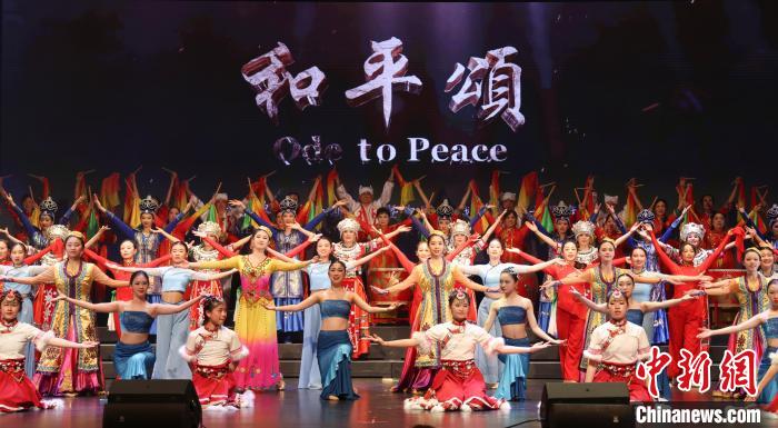 当地时间5月18日晚,加拿大华人团体携手呈现的大型音乐舞蹈史诗《和平颂》在大多伦多地区密西沙加市上演,以纪念世界反法西斯战争暨中国人民抗日战争胜利80周年。图为终曲舞蹈《欢庆》。中新社记者 余瑞冬 摄