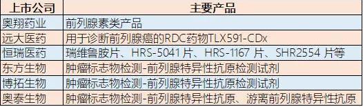 从前列腺癌的治疗方式分析,目前主要包括:药物治疗、手术治疗和放射治疗等。而在A股和港股中,也有一些相关的上市公司,例如,奥翔药业生产的前列腺素类产品,在2024年的营收为2208万元,同比下降-16.56%。而值得关注的是,虽然该类产品毛利率较2023年下降了8.75个百分点,但仍有76.21%。以及港股上市公司远大医药,该公司研发的靶向PSMA的诊断RDC药物TLX591-CDx,已在澳大利亚、美国、加拿大、英国等国家获批上市,2024年实现近5.17亿美元的销售额,而该药品在中国已完成III期临床试验患者入组。