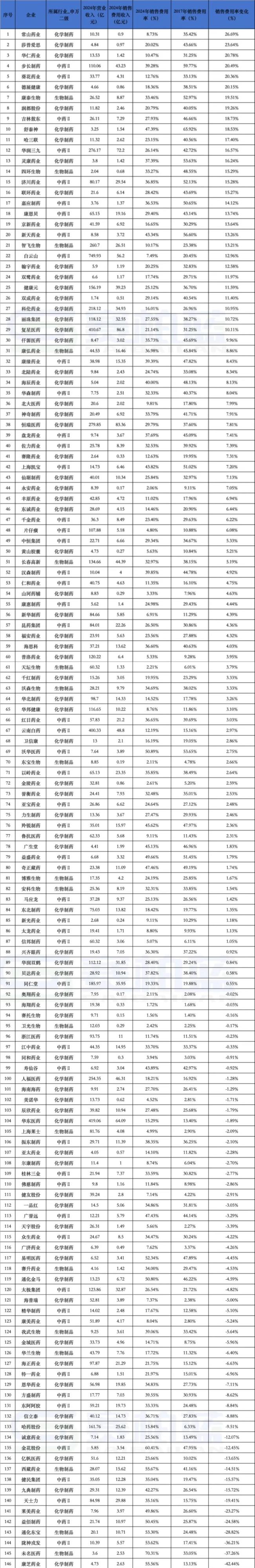 注:医药行业的类别根据巨潮资讯申万二级分类划分;营业收入数据根据巨潮资讯网数据整理,销售费用根据上市公司年报手动整理,供参考。如有错误请联系修改。以2024年同比2017年销售费用率增幅的大小排序。