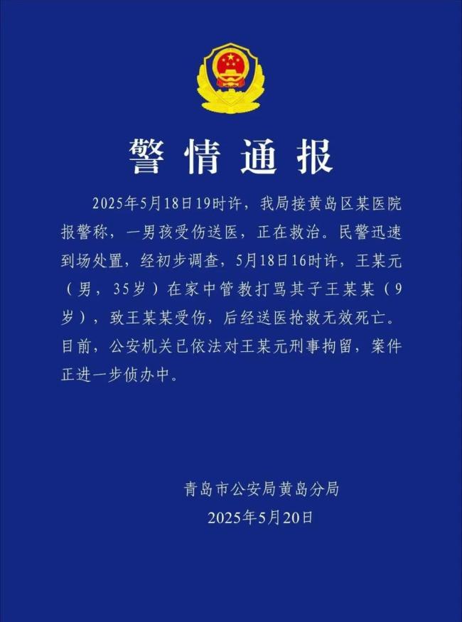 5月20日,青岛市公安局黄岛分局发布通报。通报称,5月18日19时许,黄岛区某医院报警称一男孩受伤正在救治。民警到场调查发现,当天16时许,35岁的王某元在家中管教并打骂其子王某某,导致孩子受伤。尽管医院全力抢救,但王某某最终不幸去世。目前,公安机关已依法对王某元进行刑事拘留,案件正在进一步侦办中。