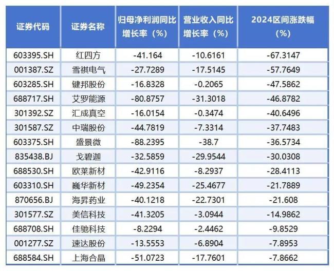 更惨的是,归母净利润同比增长率、营业收入同比增长率、2024年区间涨跌幅3个指标同时出现下滑的有15家公司,具体包括盛景微、艾罗能源、戈碧迦、巍华新材、海昇药业、上海合晶、雪祺电气、红四方、欧莱新材、中瑞股份、速达股份、美信科技、佳驰科技、汇成真空、键邦股份。