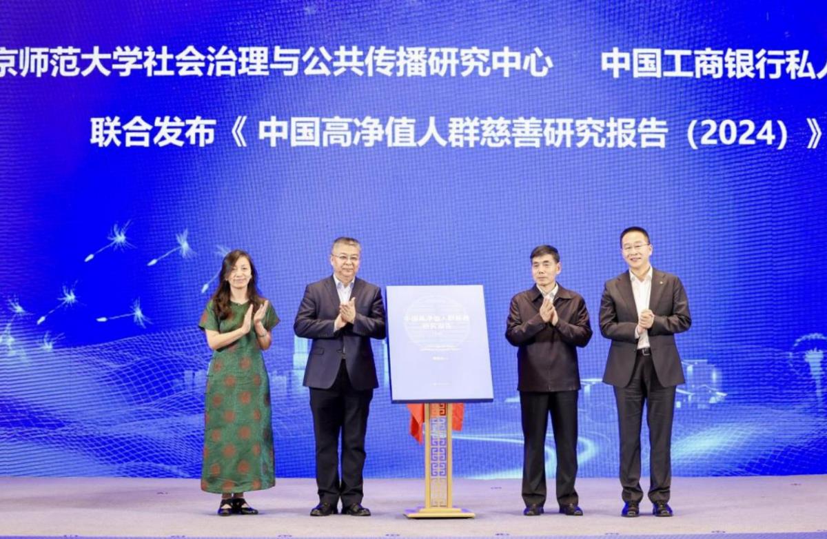 北京师范大学社会治理与公共传播研究中心及中国工商银行 私人银行部联合发布了《中国高净值人群慈善研究报告(2024)》。中央统战部光彩事业指导中心原主任余敏安,北京师范大学社会治理与公共传播研究中心主任傅昌波,中国工商银行私人银行部总经理李宝权,北京师范大学教育基金会副理事长兼秘书长李胜兰共同为新书揭幕。北京师范大学社会治理与公共传播研究中心研究部主任魏璞祯介绍了报告内容。